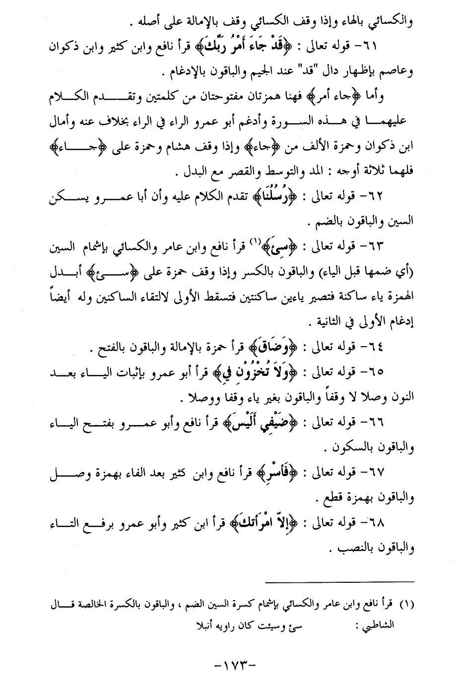 63 - قوله تعالى: (سئ) (¬1) قرأ نافع وابن عامر والكسائي بإشمام السين (أي ضمها قبل الياء) والباقون بالكسر وإذا وقف حمزة على (سئ) أبدل الهمزة ياء ساكنة فتصير ياءين ساكنتين فتسقط الأولى لالتقاء الساكنين وله أيضا إدغام الأولى في الثانية.