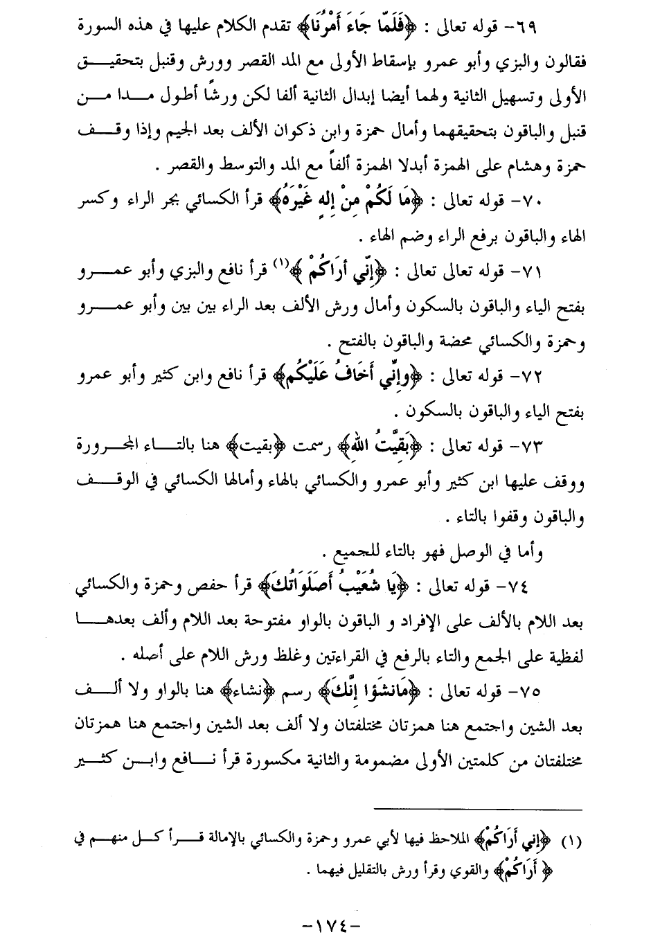 74 - قوله تعالى: يا شُعَيْبُ أَصَلاتُكَ قرأ حفص وحمزة والكسائي بعد اللام بالألف على الإفراد والباقون بالواو مفتوحة بعد اللام وألف بعدها لفظية على الجمع والتاء بالرفع في القراءتين وغلظ ورش اللام على أصله.