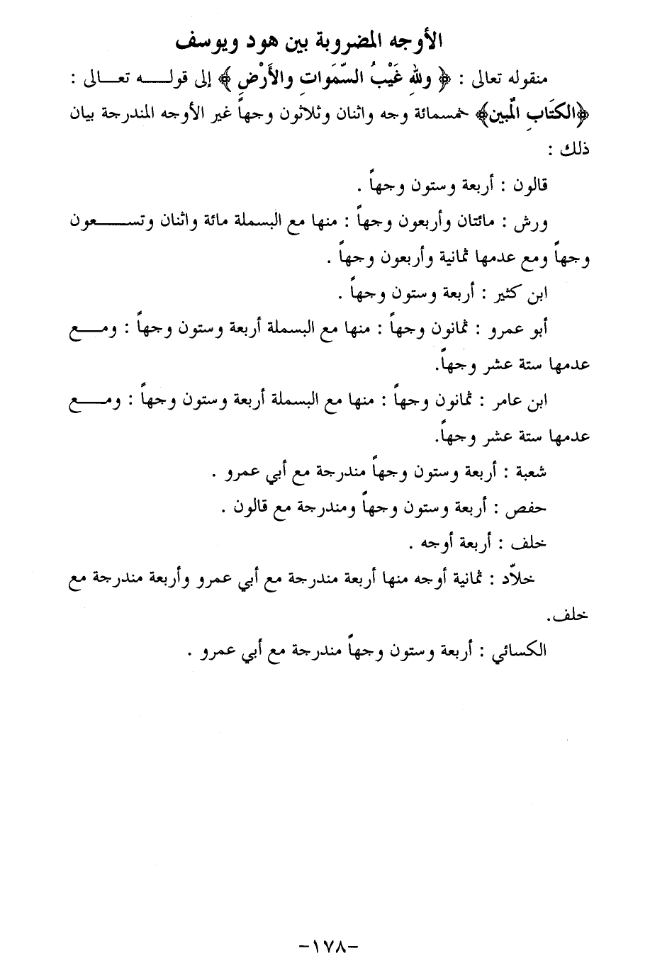 ابن عامر: ثمانون وجها: منها مع البسملة أربعة وستون وجها: ومع عدمها ستة عشر وجها.