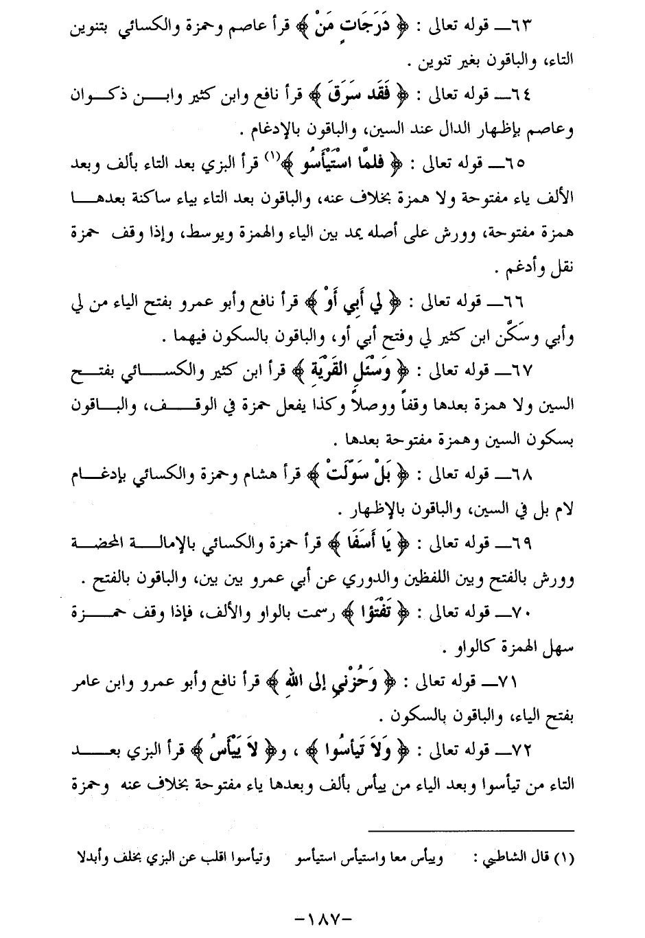 72 - قوله تعالى: وَلا تَيْأَسُوا، ولا يَيْأَسُ قرأ البزي بعد التاء من تيأسوا وبعد الياء من ييأس بألف وبعدها ياء مفتوحة بخلاف عنه وحمزة