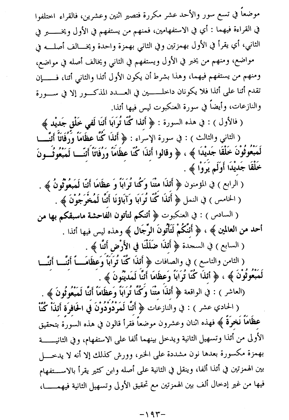 موضعا في تسع سور والأحد عشر مكررة فتصير اثنين وعشرين، فالقراء اختلفوا في القراءة فيهما: أي في الاستفهامين، فمنهم من يستفهم في الأول ويخبر في الثاني، أي يقرأ في الأول بهمزتين وفي الثاني بهمزة واحدة ويخالف أصله في مواضع، ومنهم من يخبر في الأول ويستفهم في الثاني ويخالف أصله في مواضع، ومنهم من يستفهم فيهما، وهذا بشرط أن يكون الأول أئذا والثاني أئنا، فإن تقدم أئنا على أئذا فلا يكونان داخلين في العدد المذكور إلا في سورة والنازعات، وأيضا في سورة العنكبوت ليس فيها أئذا.