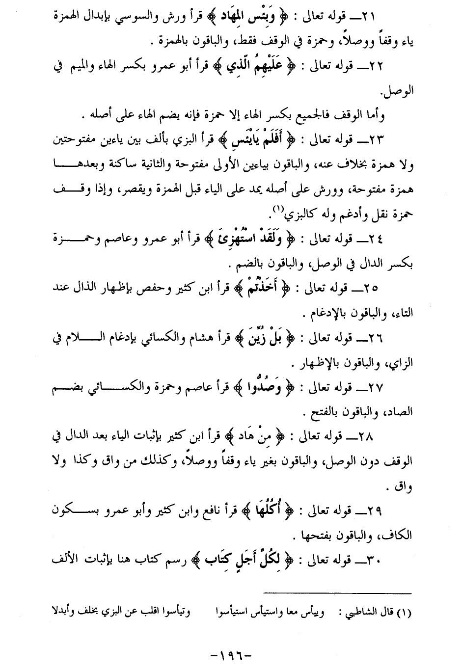 28 - قوله تعالى: مِنْ هادٍ قرأ ابن كثير بإثبات الياء بعد الدال في الوقف دون الوصل، والباقون بغير ياء وقفا ووصلا، وكذلك من واق وكذا ولا واق.
