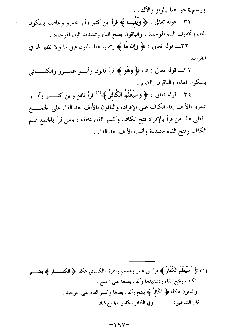 34 - قوله تعالى: (وسيعلم الكافر) (¬1) قرأ نافع وابن كثير وأبو عمرو بالألف بعد الكاف على الإفراد، والباقون بالألف بعد الفاء على الجمع فعلى هذا من قرأ بالإفراد فتح الكاف وكسر الفاء مخففة، ومن قرأ بالجمع ضم الكاف وفتح الفاء مشددة وأثبت الألف بعد الفاء.