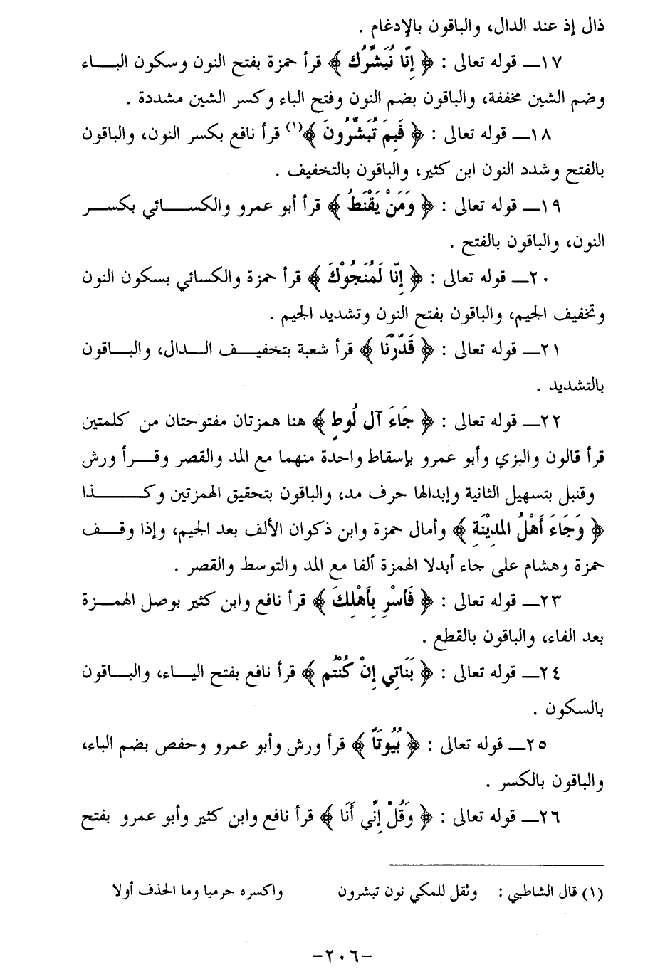 17 - قوله تعالى: إِنَّا نُبَشِّرُكَ قرأ حمزة بفتح النون وسكون الباء وضم الشين مخففة، والباقون بضم النون وفتح الباء وكسر الشين مشددة.
