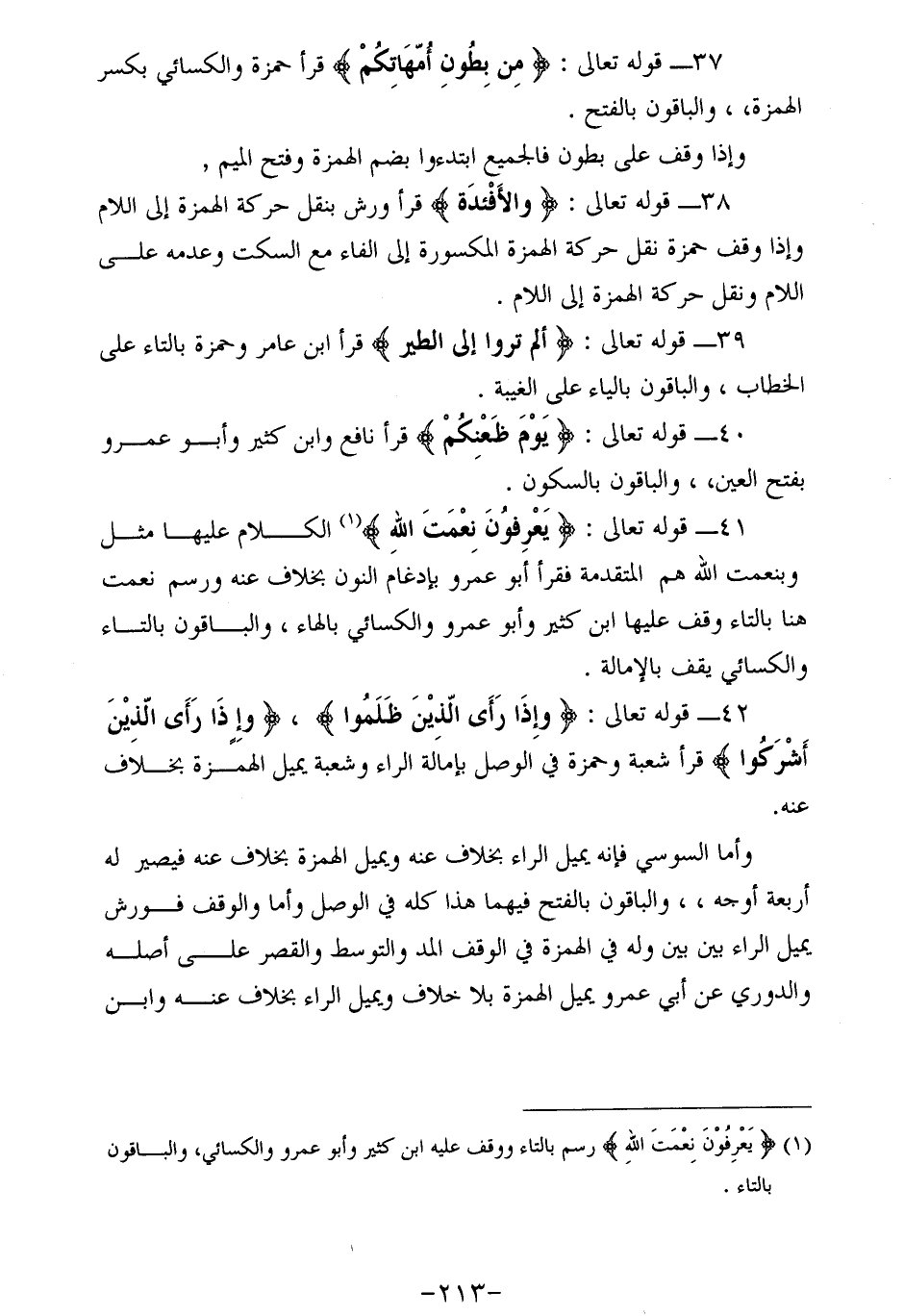 41 - قوله تعالى: يَعْرِفُونَ نِعْمَتَ اللَّهِ (¬1) الكلام عليها مثل وبنعمت الله هم المتقدمة فقرأ أبو عمرو بإدغام النون بخلاف عنه ورسم نعمت هنا بالتاء وقف عليها ابن كثير وأبو عمرو والكسائي بالهاء، والباقون بالتاء والكسائي يقف بالإمالة.