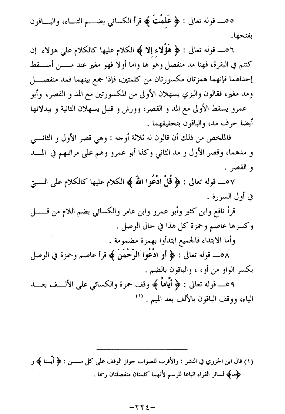 56 - قوله تعالى: هؤُلاءِ إِلَّا الكلام عليها كالكلام علي هؤلاء إن كنتم في البقرة، فهنا مد منفصل وهو ها واما أولا فهو مغير عند من أسقط إحداهما فإنهما همزتان مكسورتان من كلمتين، فإذا جمع بينهما فمد منفصل ومد مغير، فقالون والبزي يسهلان الأولى من المكسورتين مع المد والقصر، وأبو عمرو يسقط الأولى مع المد والقصر، وورش وقنبل يسهلان الثانية ويبدلانها أيضا حرف مد، والباقون بتحقيقهما.
