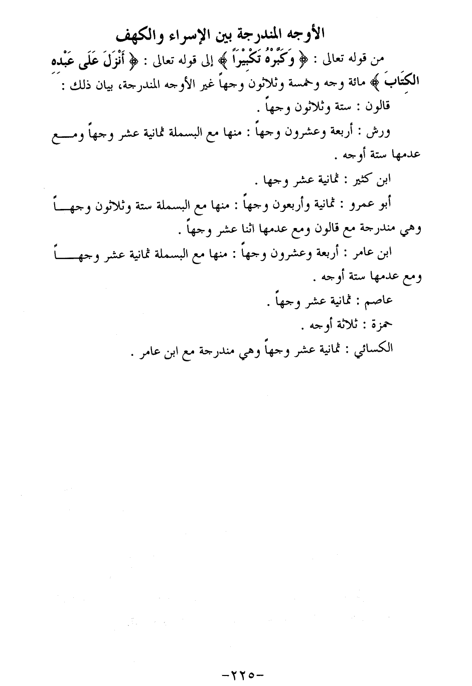 من قوله تعالى: وَكَبِّرْهُ تَكْبِيراً إلى قوله تعالى: أَنْزَلَ عَلى عَبْدِهِ الْكِتابَ مائة وجه وخمسة وثلاثون وجها غير الأوجه المندرجة، بيان ذلك:
