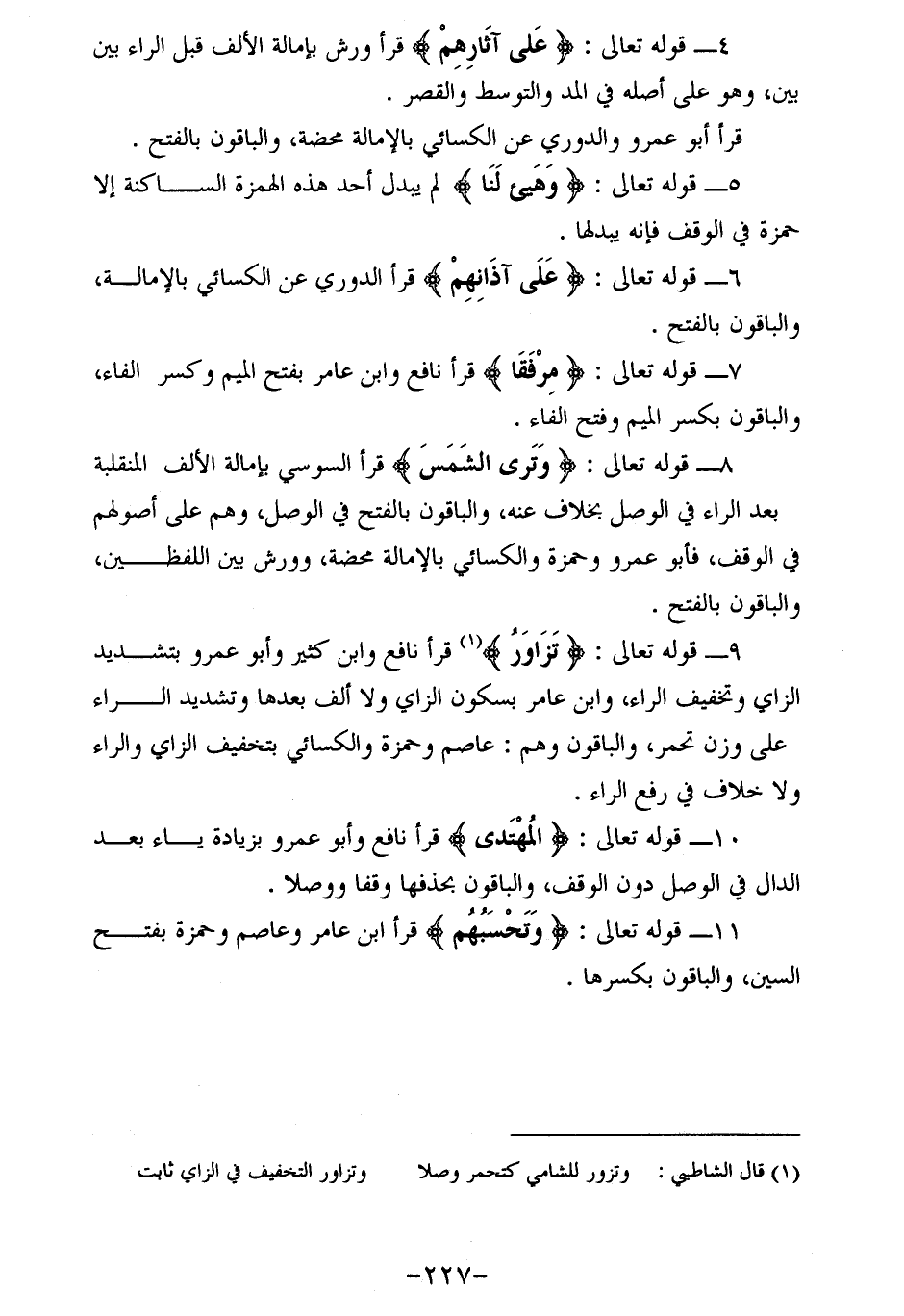 9 - قوله تعالى: (تزاور) (¬1) قرأ نافع وابن كثير وأبو عمرو بتشديد الزاي وتخفيف الراء، وابن عامر بسكون الزاي ولا ألف بعدها وتشديد الراء على وزن تحمر، والباقون وهم: عاصم وحمزة والكسائي بتخفيف الزاي والراء ولا خلاف في رفع الراء.