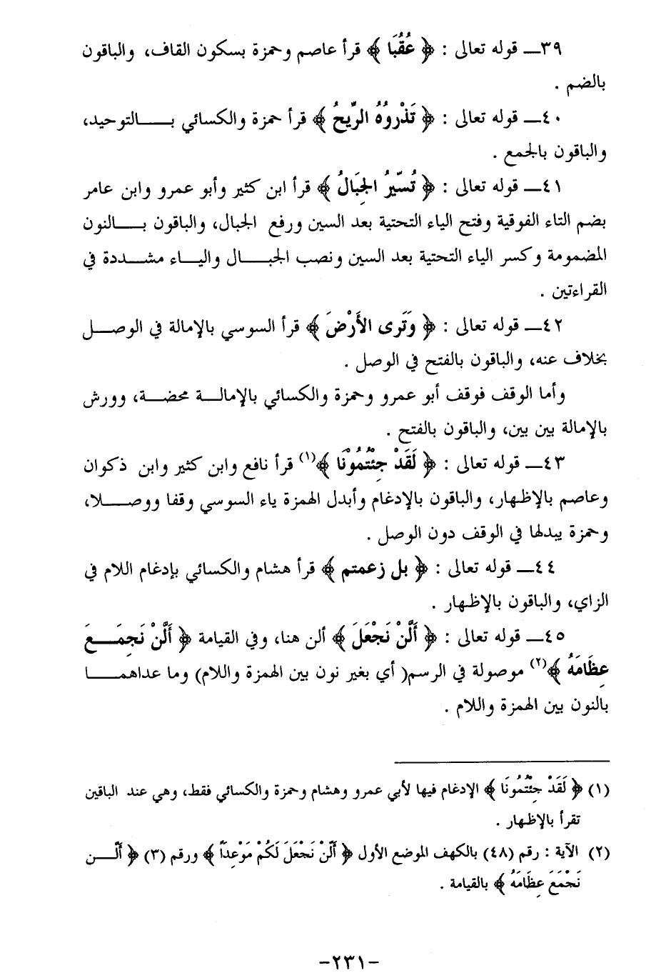 41 - قوله تعالى: تَسِيرُ الْجِبالُ قرأ ابن كثير وأبو عمرو وابن عامر بضم التاء الفوقية وفتح الياء التحتية بعد السين ورفع الجبال، والباقون بالنون المضمومة وكسر الياء التحتية بعد السين ونصب الجبال والياء مشددة في القراءتين.