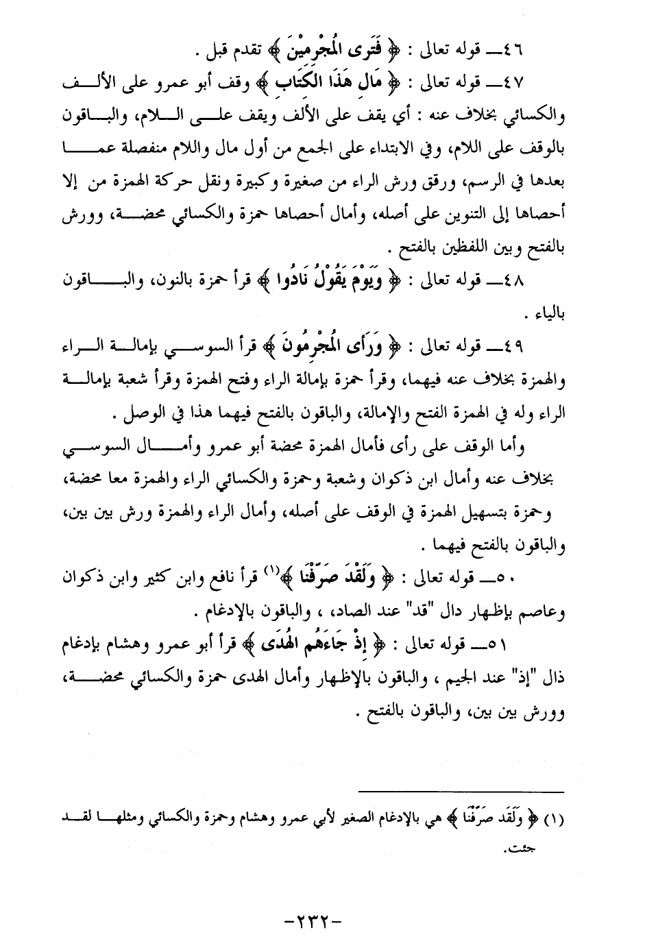 49 - قوله تعالى: وَرَأَى الْمُجْرِمُونَ قرأ السوسي بإمالة الراء والهمزة بخلاف عنه فيهما، وقرأ حمزة بإمالة الراء وفتح الهمزة وقرأ شعبة بإمالة الراء وله في الهمزة الفتح والإمالة، والباقون بالفتح فيهما هذا في الوصل.
