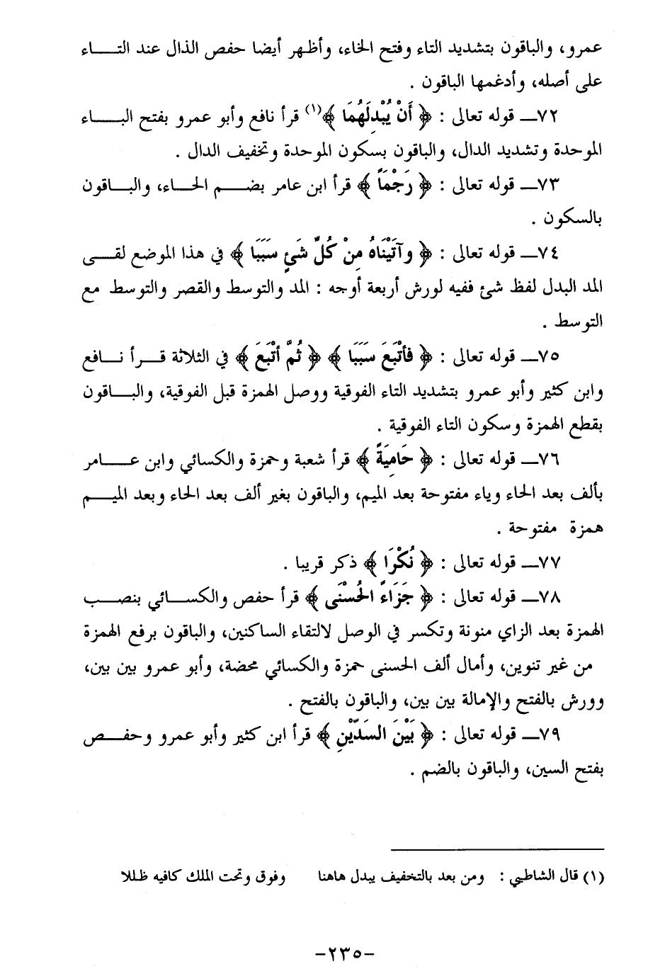 74 - قوله تعالى: وَآتَيْناهُ مِنْ كُلِّ شَيْءٍ سَبَباً في هذا الموضع لقى المد البدل لفظ شىء ففيه لورش أربعة أوجه: المد والتوسط والقصر والتوسط مع التوسط.