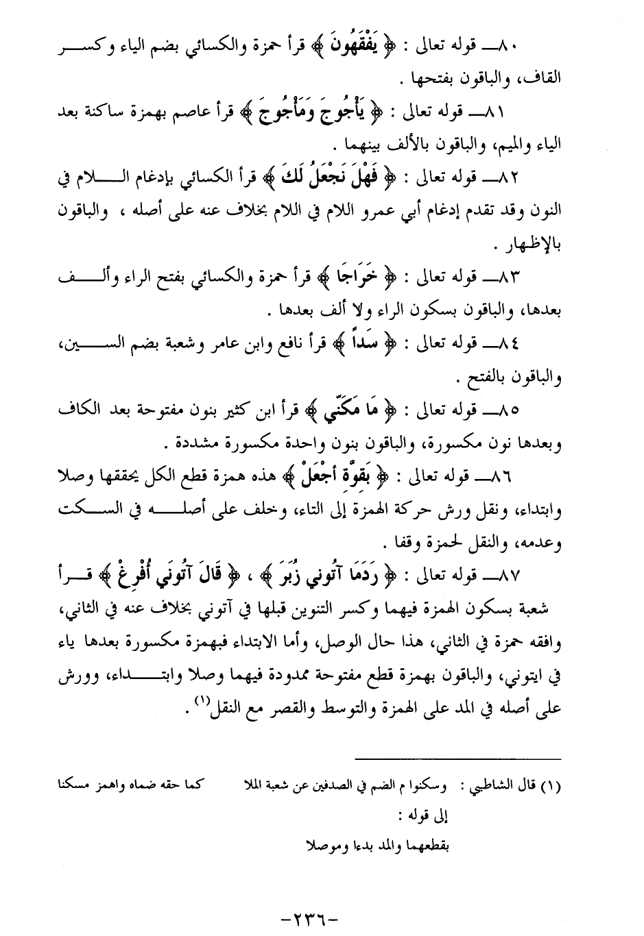 87 - قوله تعالى: رَدْماً آتُونِي زُبَرَ، قالَ آتُونِي أُفْرِغْ قرأ شعبة بسكون الهمزة فيهما وكسر التنوين قبلها في آتوني بخلاف عنه في الثاني، وافقه حمزة في الثاني، هذا حال الوصل، وأما الابتداء فبهمزة مكسورة بعدها ياء في ايتوني، والباقون بهمزة قطع مفتوحة ممدودة فيهما وصلا وابتداء، وورش على أصله في المد على الهمزة والتوسط والقصر مع النقل (¬1).