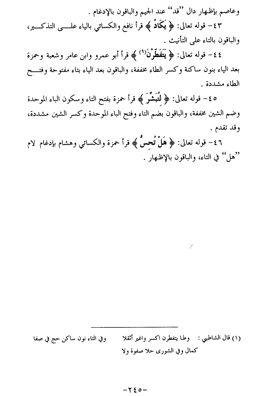 44 - قوله تعالى: يَتَفَطَّرْنَ (¬1) قرأ أبو عمرو وابن عامر وشعبة وحمزة بعد الياء بنون ساكنة وكسر الطاء مخففة، والباقون بعد الياء بتاء مفتوحة وفتح الطاء مشددة.