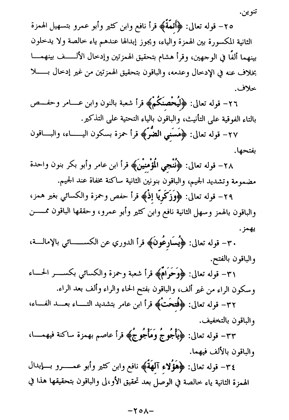 25 - قوله تعالى: أَئِمَّةً قرأ نافع وابن كثير وأبو عمرو بتسهيل الهمزة الثانية المكسورة بين الهمزة والياء، ويجوز إبدالها عندهم ياء خالصة ولا يدخلون بينهما ألفا في الوجهين، وقرأ هشام بتحقيق الهمزتين وإدخال الألف بينهما بخلاف عنه في الإدخال وعدمه، والباقون بتحقيق الهمزتين من غير إدخال بلا خلاف.