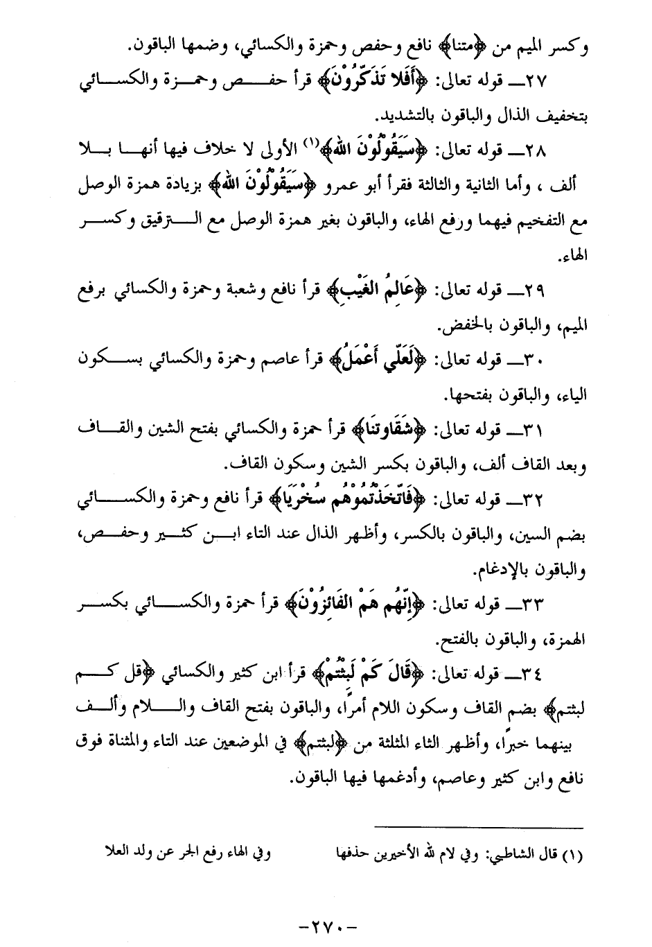 28 - قوله تعالى: سَيَقُولُونَ لِلَّهِ (¬1) الأولى لا خلاف فيها أنها بلا ألف، وأما الثانية والثالثة فقرأ أبو عمرو (سيقولون الله) بزيادة همزة الوصل مع التفخيم فيهما ورفع الهاء، والباقون بغير همزة الوصل مع الترقيق وكسر الهاء.