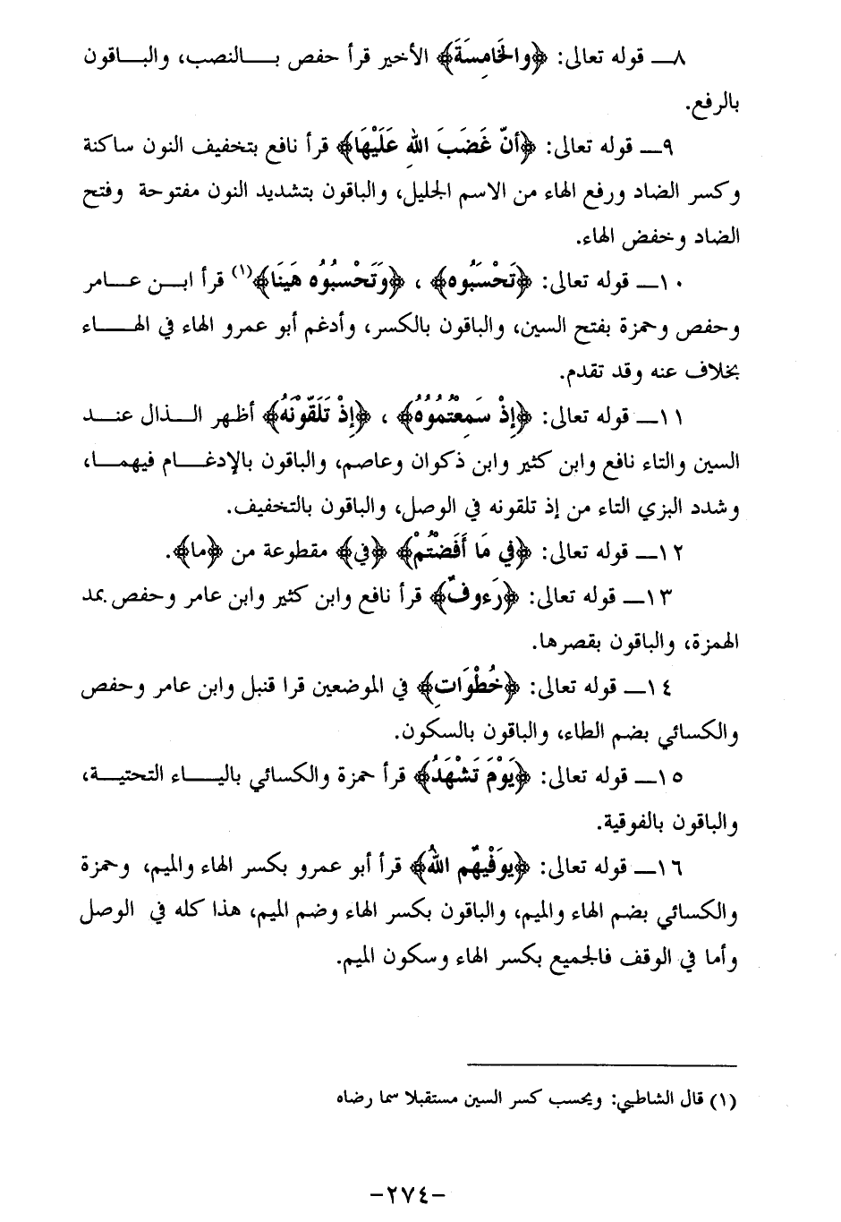 9 - قوله تعالى: أَنَّ غَضَبَ اللَّهِ عَلَيْها قرأ نافع بتخفيف النون ساكنة وكسر الضاد ورفع الهاء من الاسم الجليل، والباقون بتشديد النون مفتوحة وفتح الضاد وخفض الهاء.