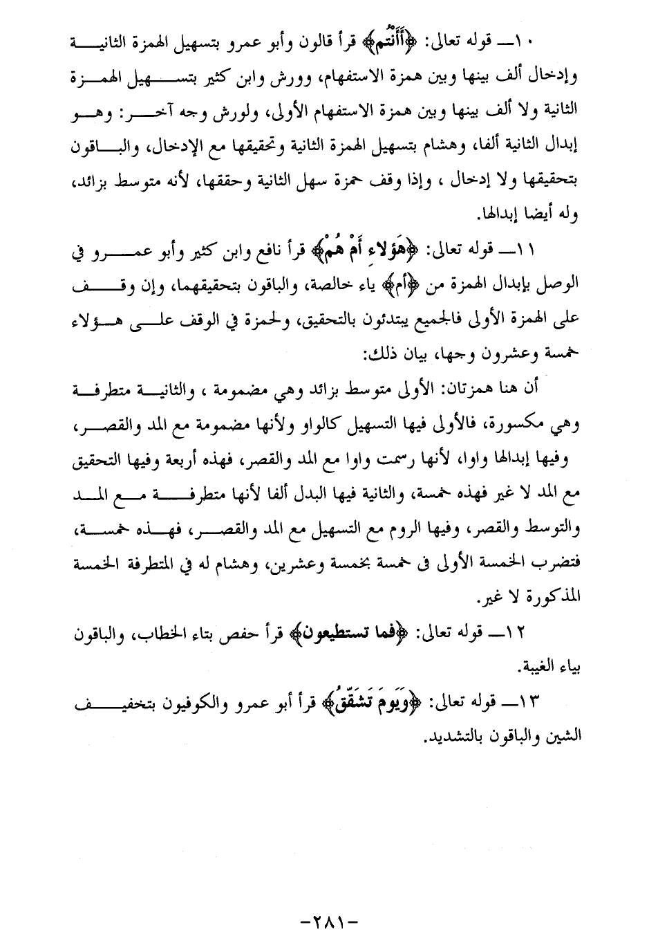10 - قوله تعالى: أَأَنْتُمْ قرأ قالون وأبو عمرو بتسهيل الهمزة الثانية وإدخال ألف بينها وبين همزة الاستفهام، وورش وابن كثير بتسهيل الهمزة الثانية ولا ألف بينها وبين همزة الاستفهام الأولى، ولورش وجه آخر: وهو إبدال الثانية ألفا، وهشام بتسهيل الهمزة الثانية وتحقيقها مع الإدخال، والباقون بتحقيقها ولا إدخال، وإذا وقف حمزة سهل الثانية وحققها، لأنه متوسط بزائد، وله أيضا إبدالها.