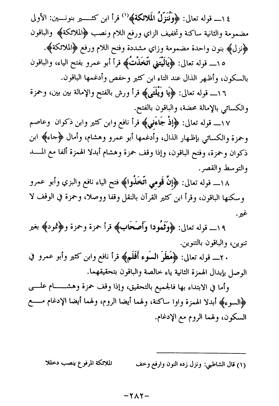 14 - قوله تعالى: (وننزّل الملائكة) (¬1) قرأ ابن كثير بنونين: الأولى مضمومة والثانية ساكنة وتخفيف الزاي ورفع اللام ونصب الْمَلائِكَةُ والباقون (نزل) بنون واحدة مضمومة وزاي مشددة وفتح اللام ورفع الْمَلائِكَةُ.