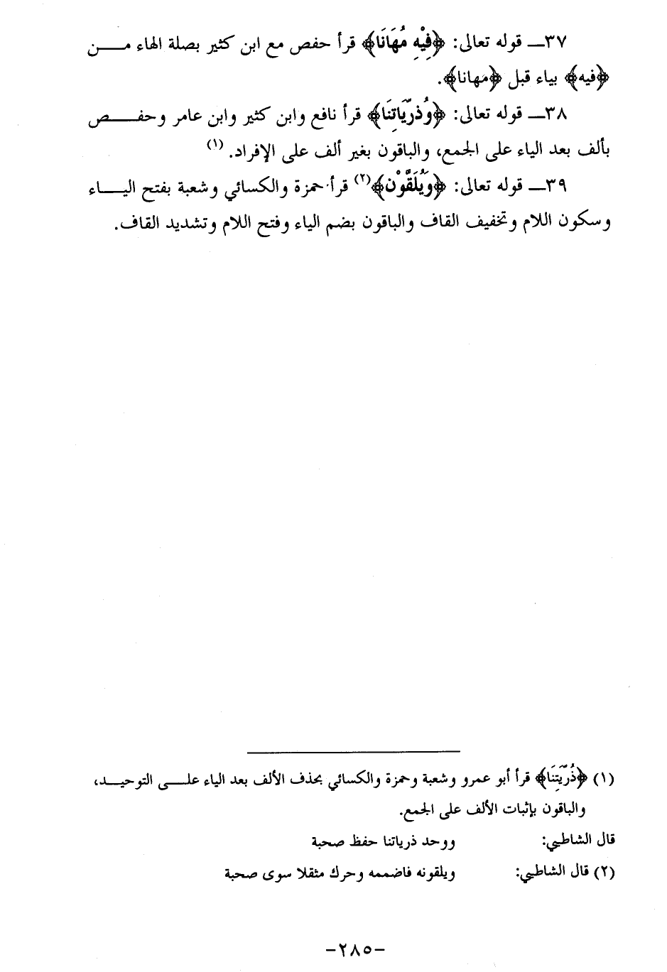 39 - قوله تعالى: وَيُلَقَّوْنَ (¬2) قرأ حمزة والكسائي وشعبة بفتح الياء وسكون اللام وتخفيف القاف والباقون بضم الياء وفتح اللام وتشديد القاف.