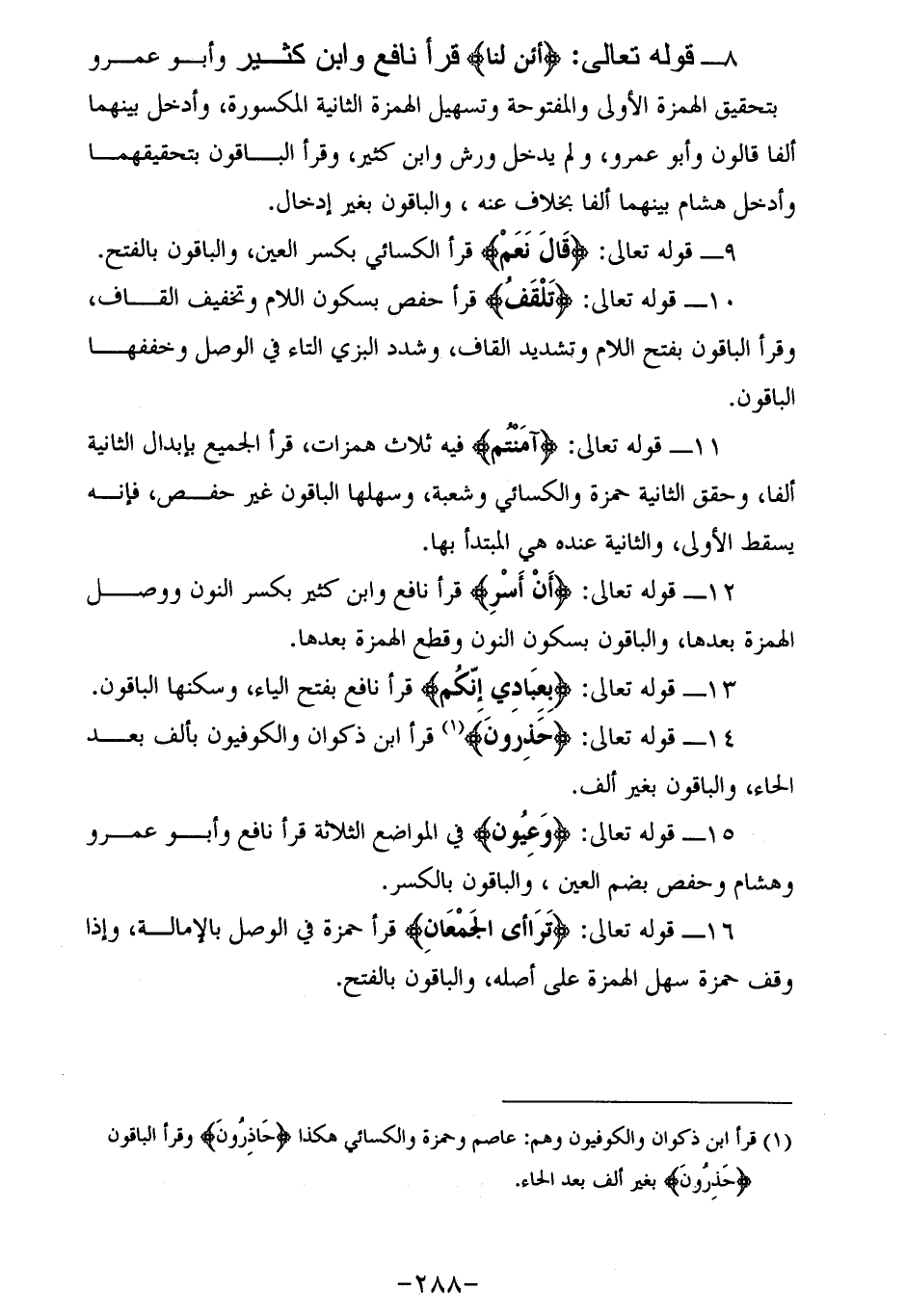 11 - قوله تعالى: آمَنْتُمْ فيه ثلاث همزات، قرأ الجميع بإبدال الثانية ألفا، وحقق الثانية حمزة والكسائي وشعبة، وسهلها الباقون غير حفص، فإنه يسقط الأولى، والثانية عنده هي المبتدأ بها.