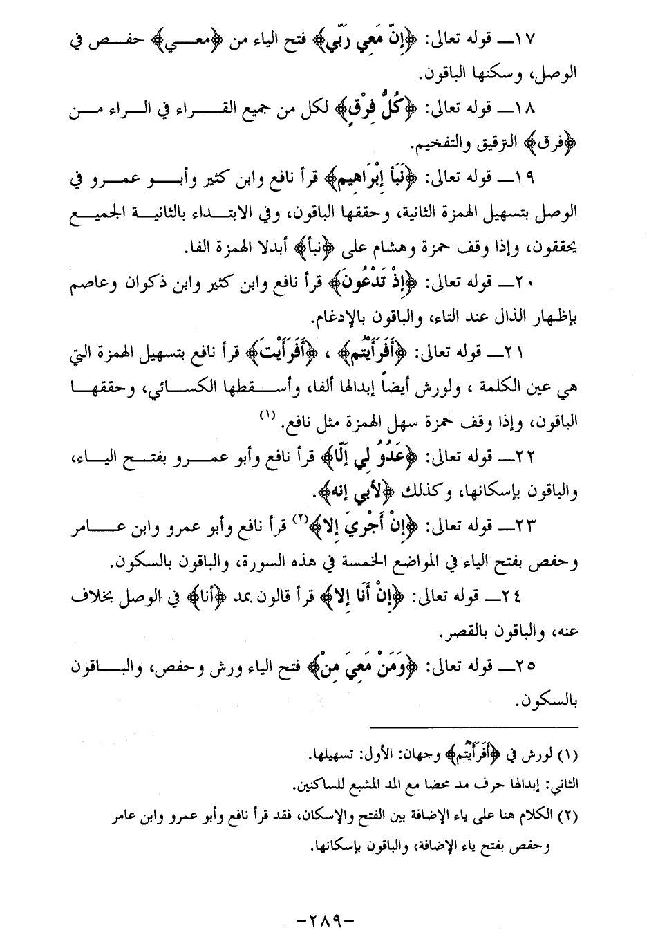 (¬2) الكلام هنا على ياء الإضافة بين الفتح والإسكان، فقد قرأ نافع وأبو عمرو وابن عامر وحفص بفتح ياء الإضافة، والباقون بإسكانها.