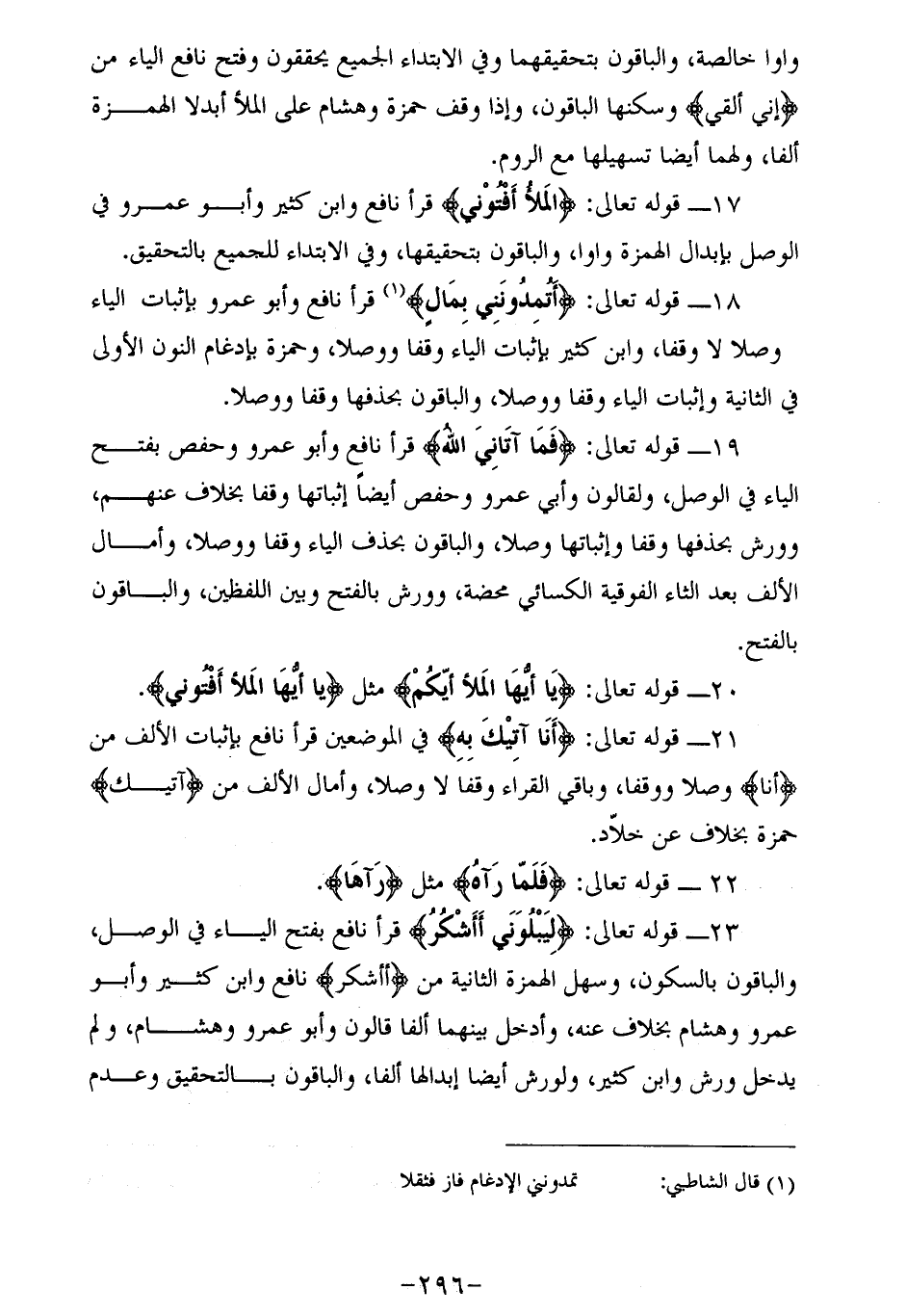 18 - قوله تعالى: (أتمدونني بمال) (¬1) قرأ نافع وأبو عمرو بإثبات الياء وصلا لا وقفا، وابن كثير بإثبات الياء وقفا ووصلا، وحمزة بإدغام النون الأولى في الثانية وإثبات الياء وقفا ووصلا، والباقون بحذفها وقفا ووصلا.
