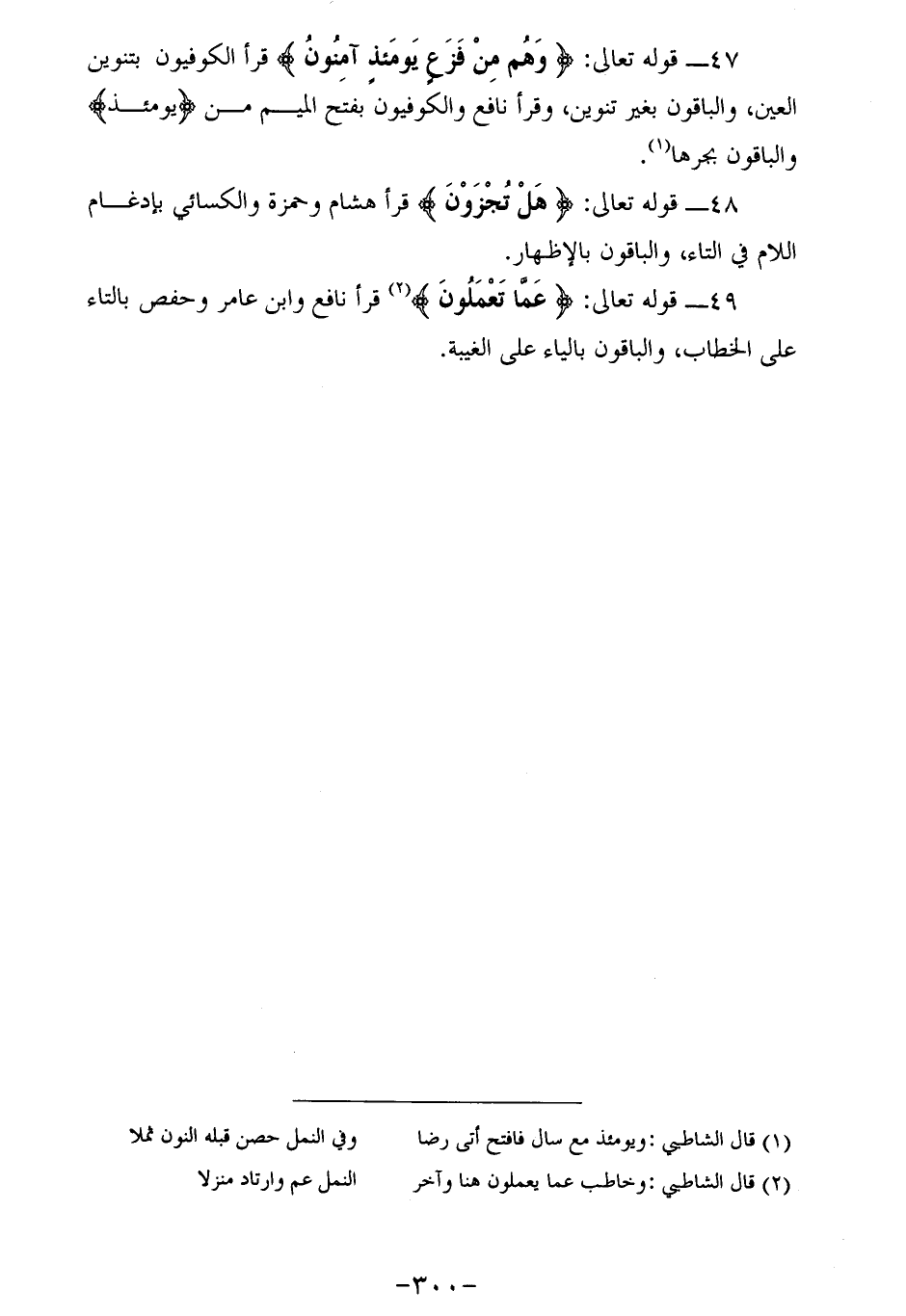 49 - قوله تعالى: عَمَّا تَعْمَلُونَ (¬2) قرأ نافع وابن عامر وحفص بالتاء على الخطاب، والباقون بالياء على الغيبة.