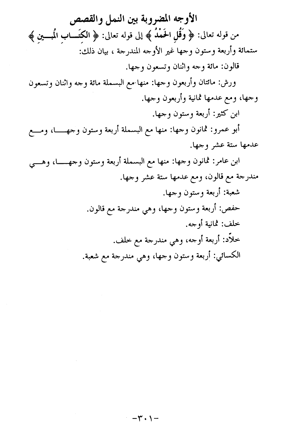 ابن عامر: ثمانون وجها: منها مع البسملة أربعة وستون وجها، وهي مندرجة مع قالون، ومع عدمها ستة عشر وجها.