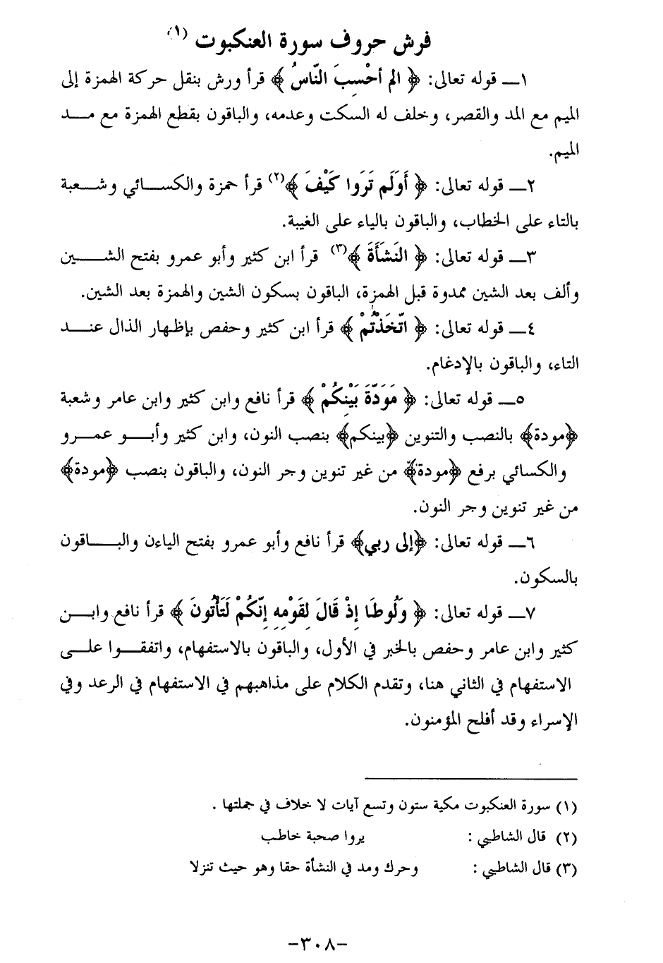 1 - قوله تعالى: الم أَحَسِبَ النَّاسُ قرأ ورش بنقل حركة الهمزة إلى الميم مع المد والقصر، وخلف له السكت وعدمه، والباقون بقطع الهمزة مع مد الميم.