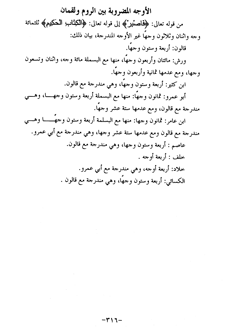ابن عامر: ثمانون وجها: منها مع البسملة أربعة وستون وجها وهي مندرجة مع قالون ومع عدمها ستة عشر وجها، وهي مندرجة مع أبي عمرو.
