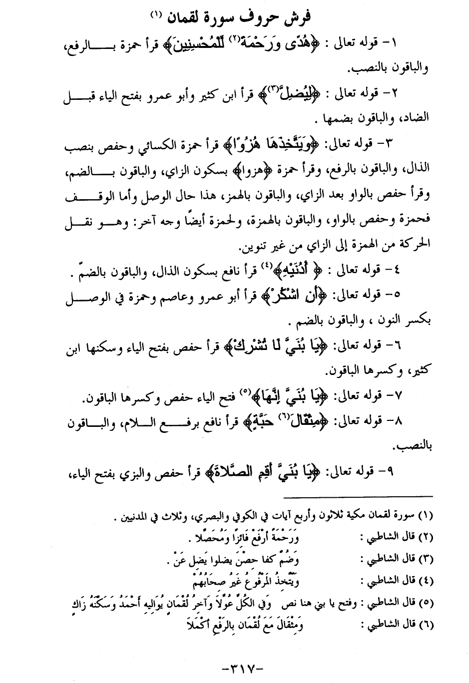 (¬5) قال الشاطبي: وفتح يا بني هنا نص وفي الكلّ عوّلا وآخر لقمان يواليه أحمد وسكنه زاك