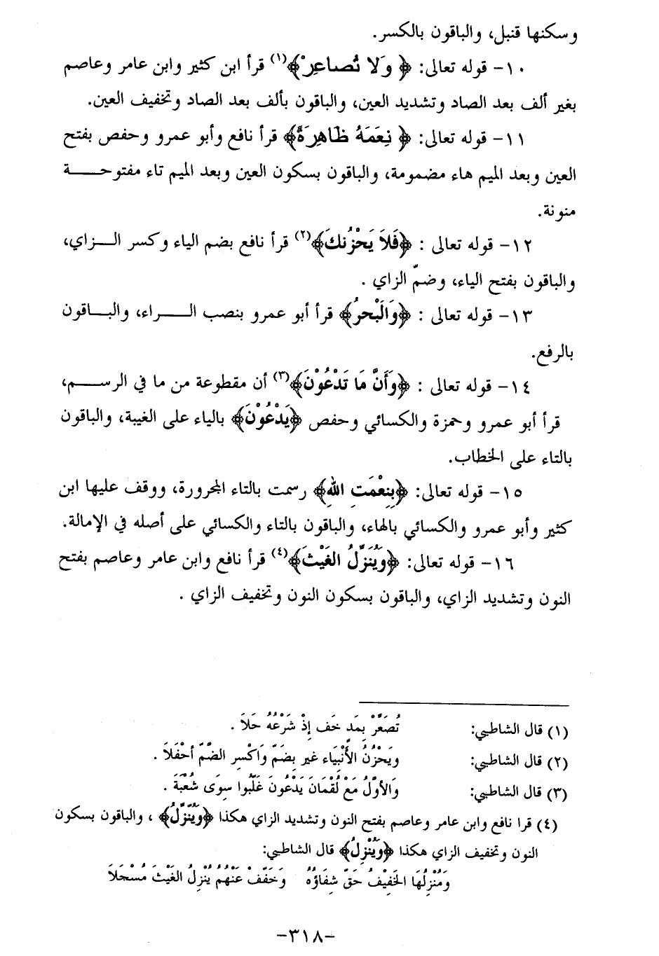 (¬4) قرأ نافع وابن عامر وعاصم بفتح النون وتشديد الزاي هكذا وَيُنَزِّلُ، والباقون بسكون النون وتخفيف الزاي هكذا وَيُنَزِّلُ قال الشاطبي: