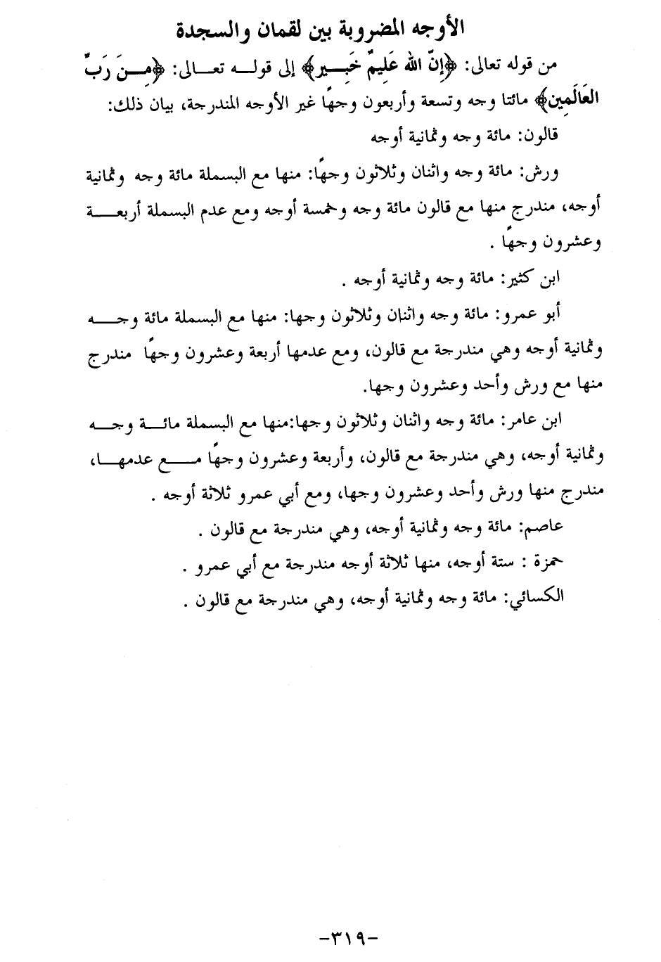 من قوله تعالى: إِنَّ اللَّهَ عَلِيمٌ خَبِيرٌ إلى قوله تعالى: مِنْ رَبِّ الْعالَمِينَ مائتا وجه وتسعة وأربعون وجها غير الأوجه المندرجة، بيان ذلك: