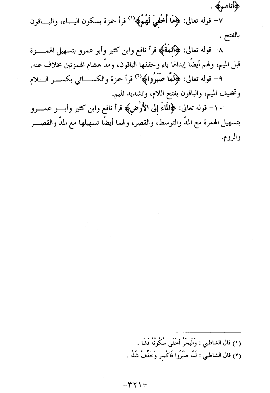 10 - قوله تعالى: الْماءَ إِلَى الْأَرْضِ قرأ نافع وابن كثير وأبو عمرو بتسهيل الهمزة مع المدّ والتوسط، والقصر، ولهما أيضا تسهيلها مع المدّ والقصر والروم.