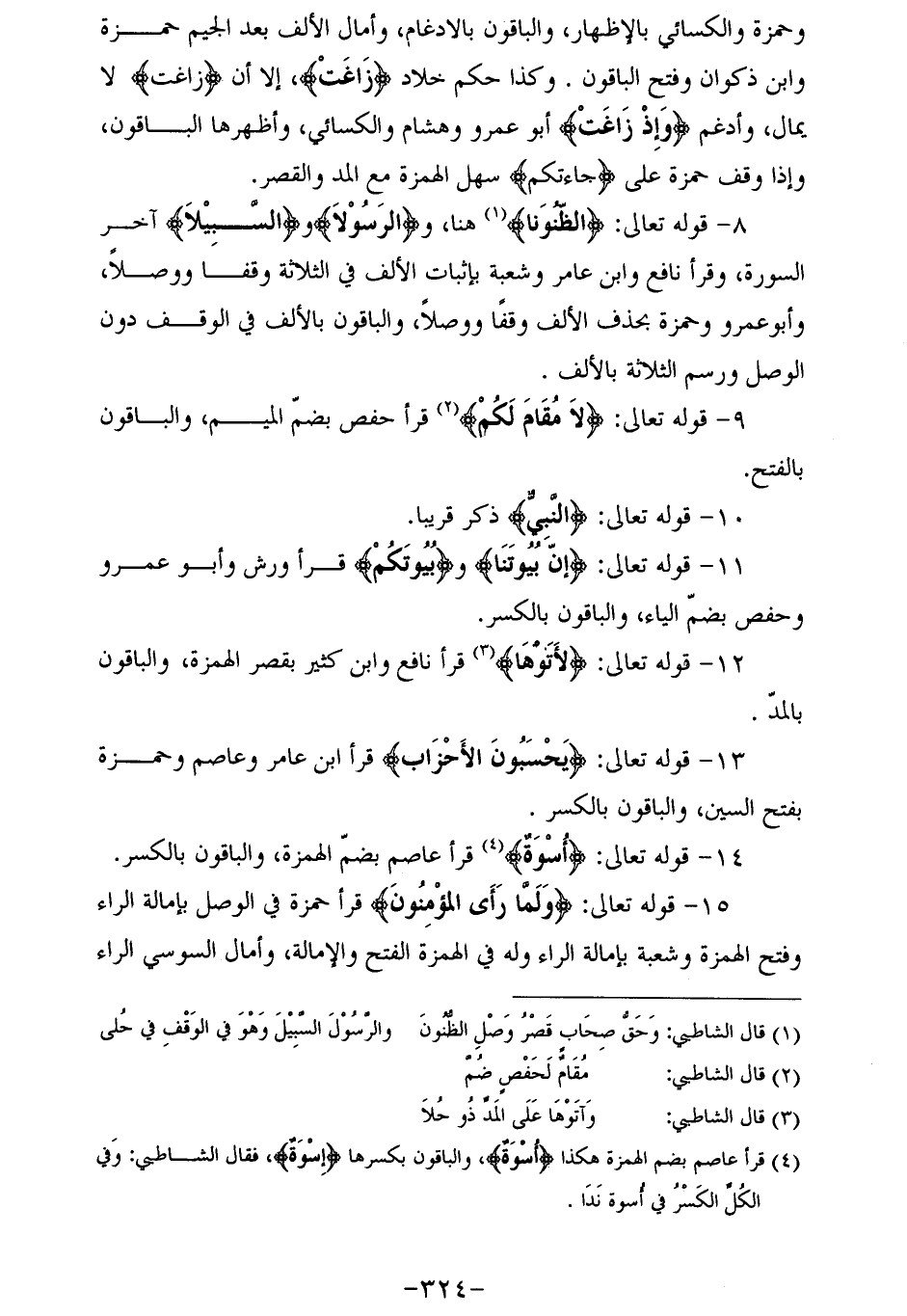 8 - قوله تعالى: الظُّنُونَا (¬1) هنا، والرَّسُولَا والسَّبِيلَا آخر السورة، وقرأ نافع وابن عامر وشعبة بإثبات الألف في الثلاثة وقفا ووصلا، وأبو عمرو وحمزة بحذف الألف وقفا ووصلا، والباقون بالألف في الوقف دون الوصل ورسم الثلاثة بالألف.