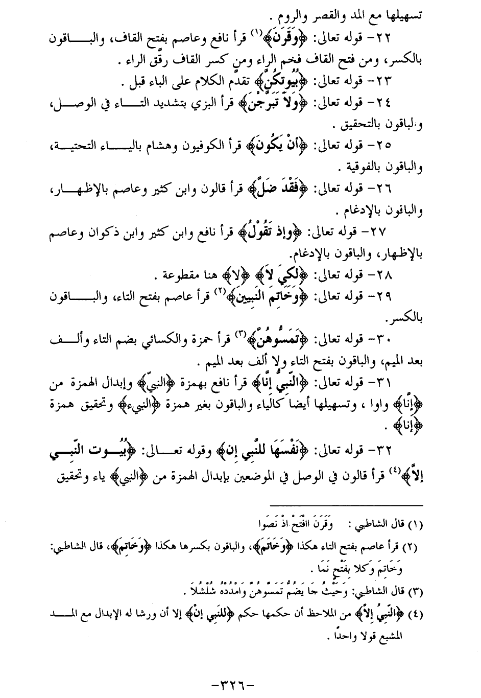 22 - قوله تعالى: وَقَرْنَ (¬1) قرأ نافع وعاصم بفتح القاف، والباقون بالكسر، ومن فتح القاف فخم الراء ومن كسر القاف رقّق الراء.