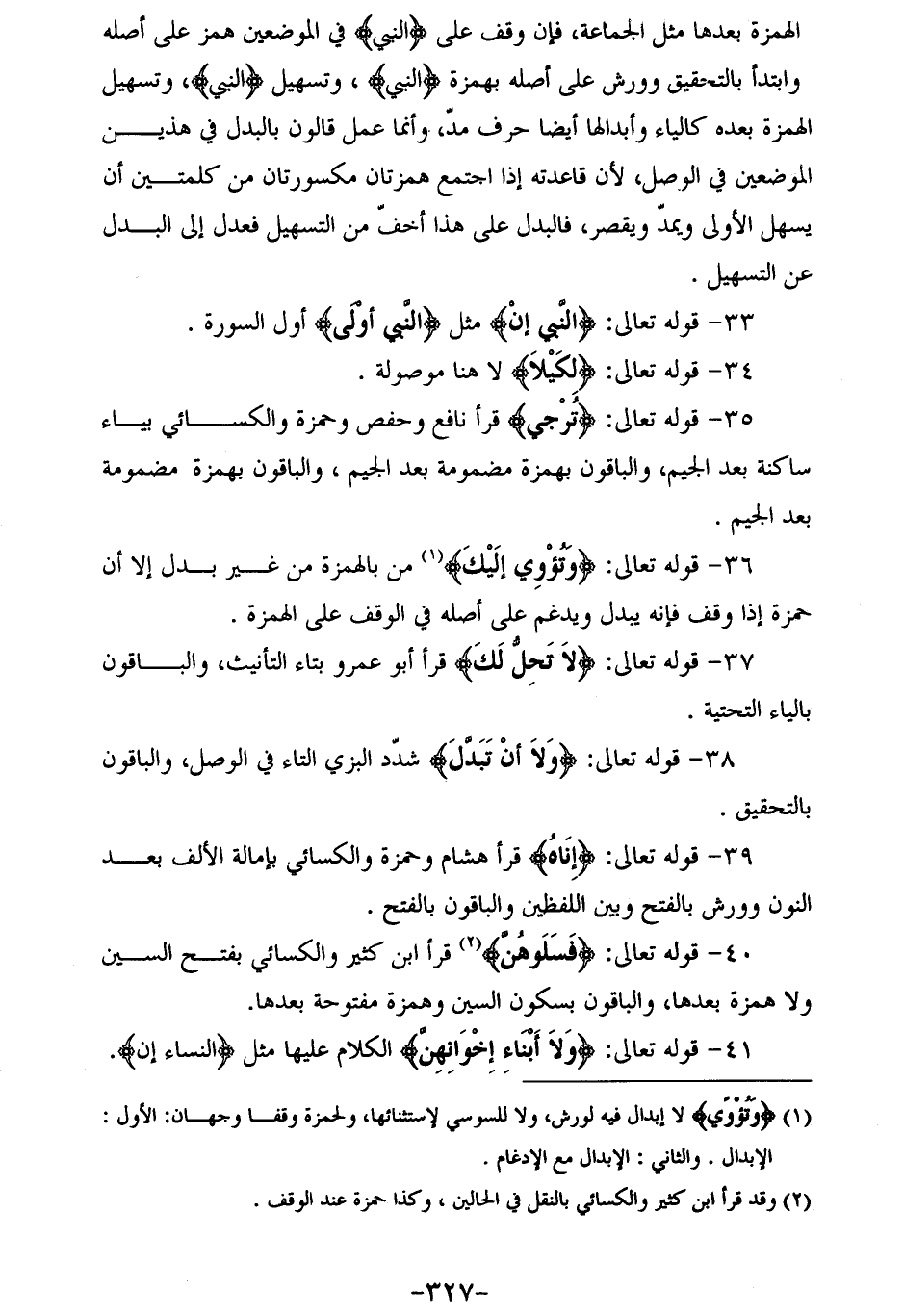 36 - قوله تعالى: (وتؤي إليك) (¬1) من بالهمزة من غير بدل إلا أن حمزة إذا وقف فإنه يبدل ويدغم على أصله في الوقف على الهمزة.