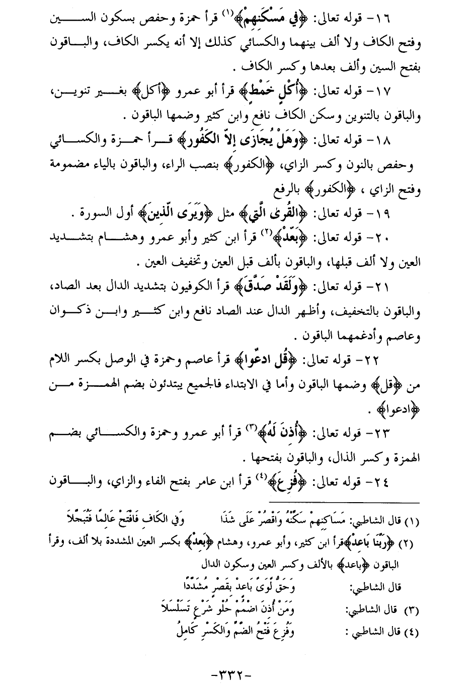 (¬2) رَبَّنا باعِدْ قرأ ابن كثير، وأبو عمرو، وهشام (بعد) بكسر العين المشددة بلا ألف، وقرأ الباقون باعِدْ بالألف وكسر العين وسكون الدال قال الشاطبي: وحقّ لوى باعد بقصر مشدّدا