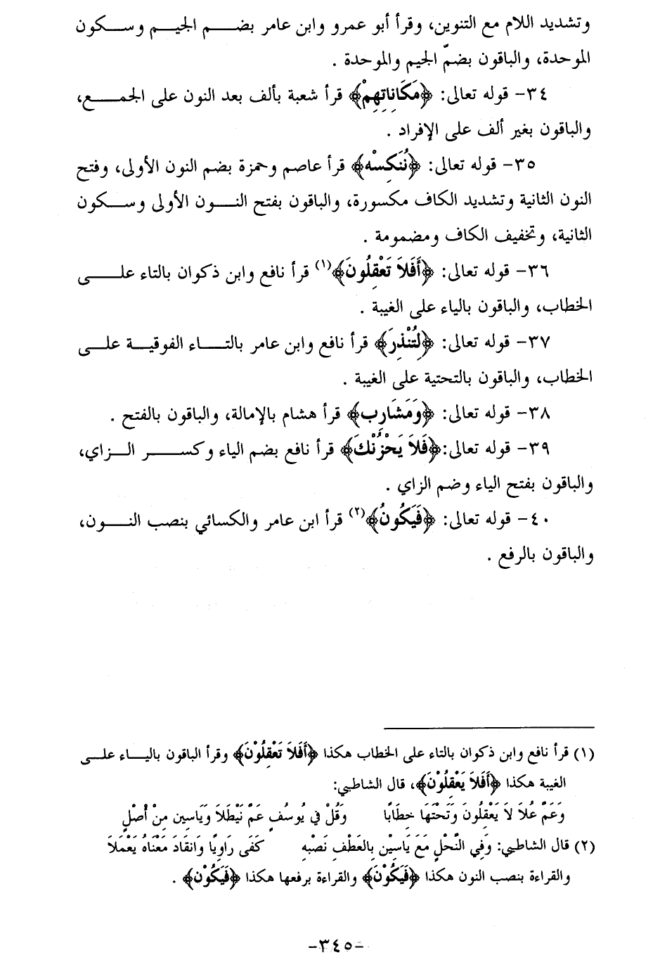 (¬1) قرأ نافع وابن ذكوان بالتاء على الخطاب هكذا (افلا تعقلون) وقرأ الباقون بالياء على الغيبة هكذا أَفَلا يَعْقِلُونَ، قال الشاطبي: