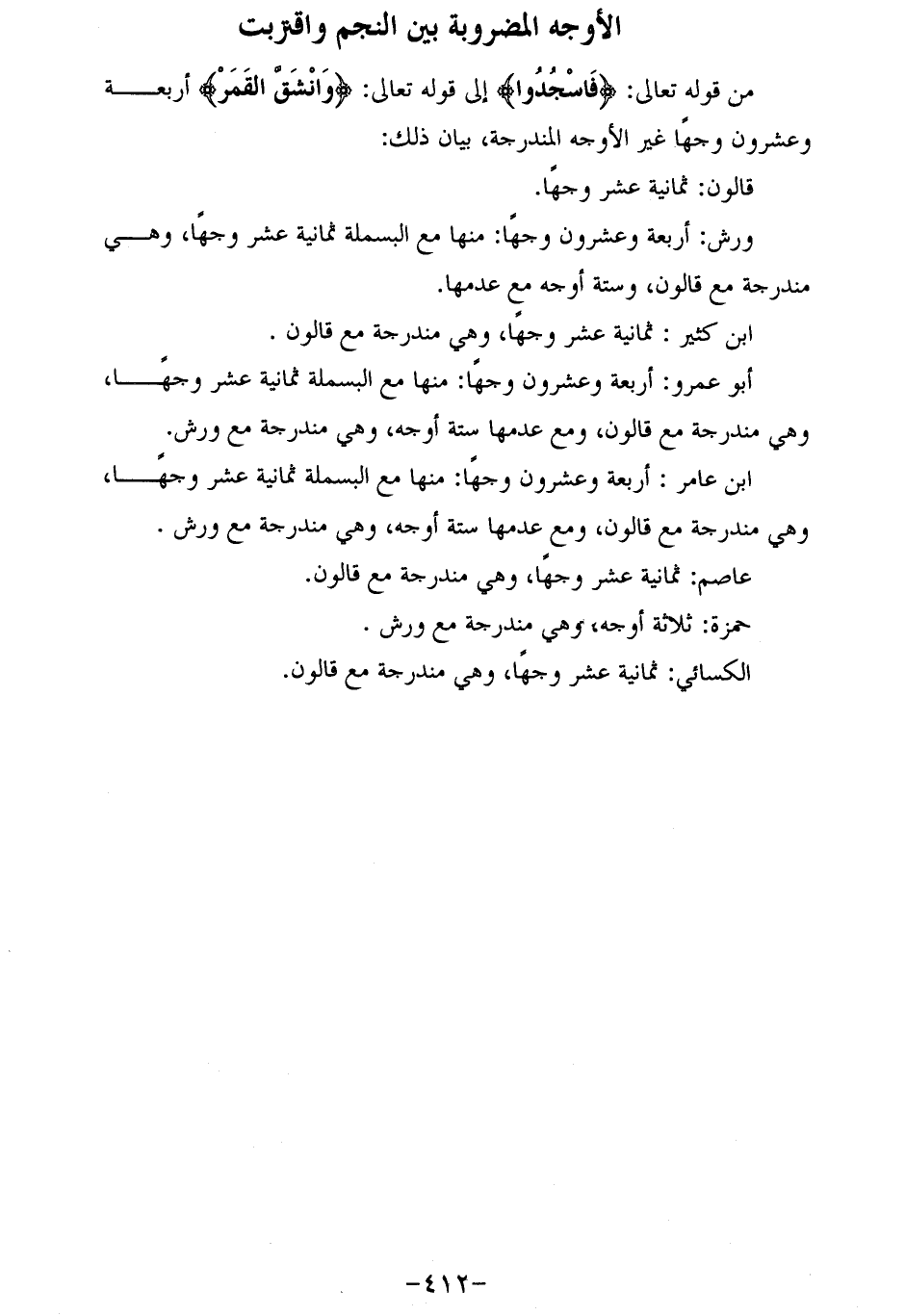 من قوله تعالى: فَاسْجُدُوا إلى قوله تعالى: وَانْشَقَّ الْقَمَرُ أربعة وعشرون وجها غير الأوجه المندرجة، بيان ذلك: