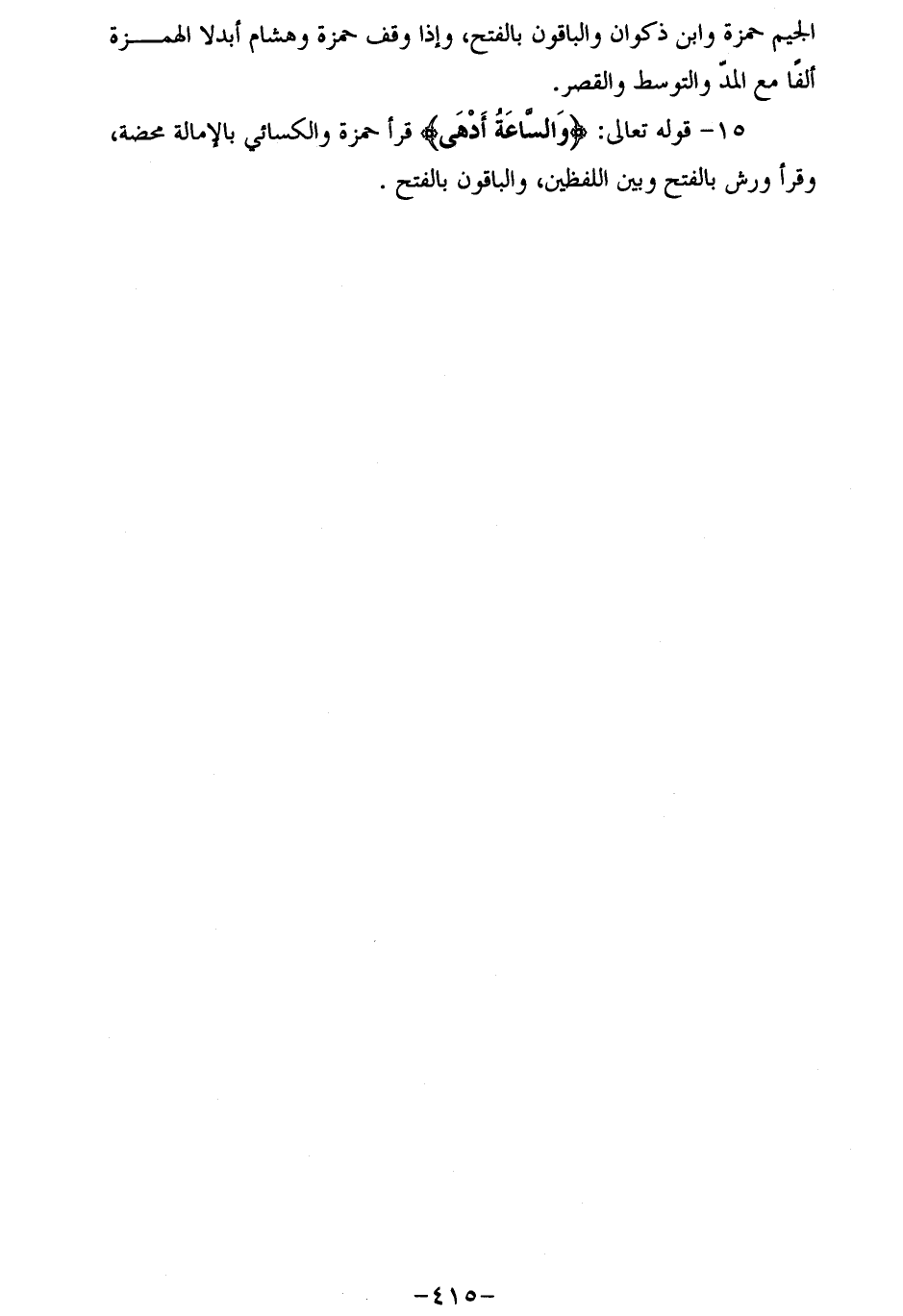 15 - قوله تعالى: وَالسَّاعَةُ أَدْهى قرأ حمزة والكسائي بالإمالة محضة، وقرأ ورش بالفتح وبين اللفظين، والباقون بالفتح.