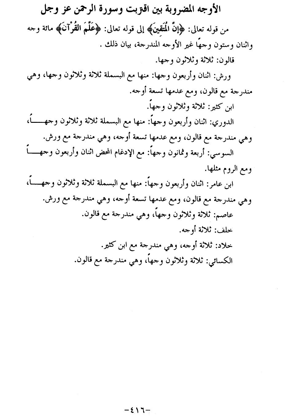 ابن عامر: اثنان وأربعون وجها: منها مع البسملة ثلاثة وثلاثون وجها، وهي مندرجة مع قالون، ومع عدمها تسعة أوجه، وهي مندرجة مع ورش.