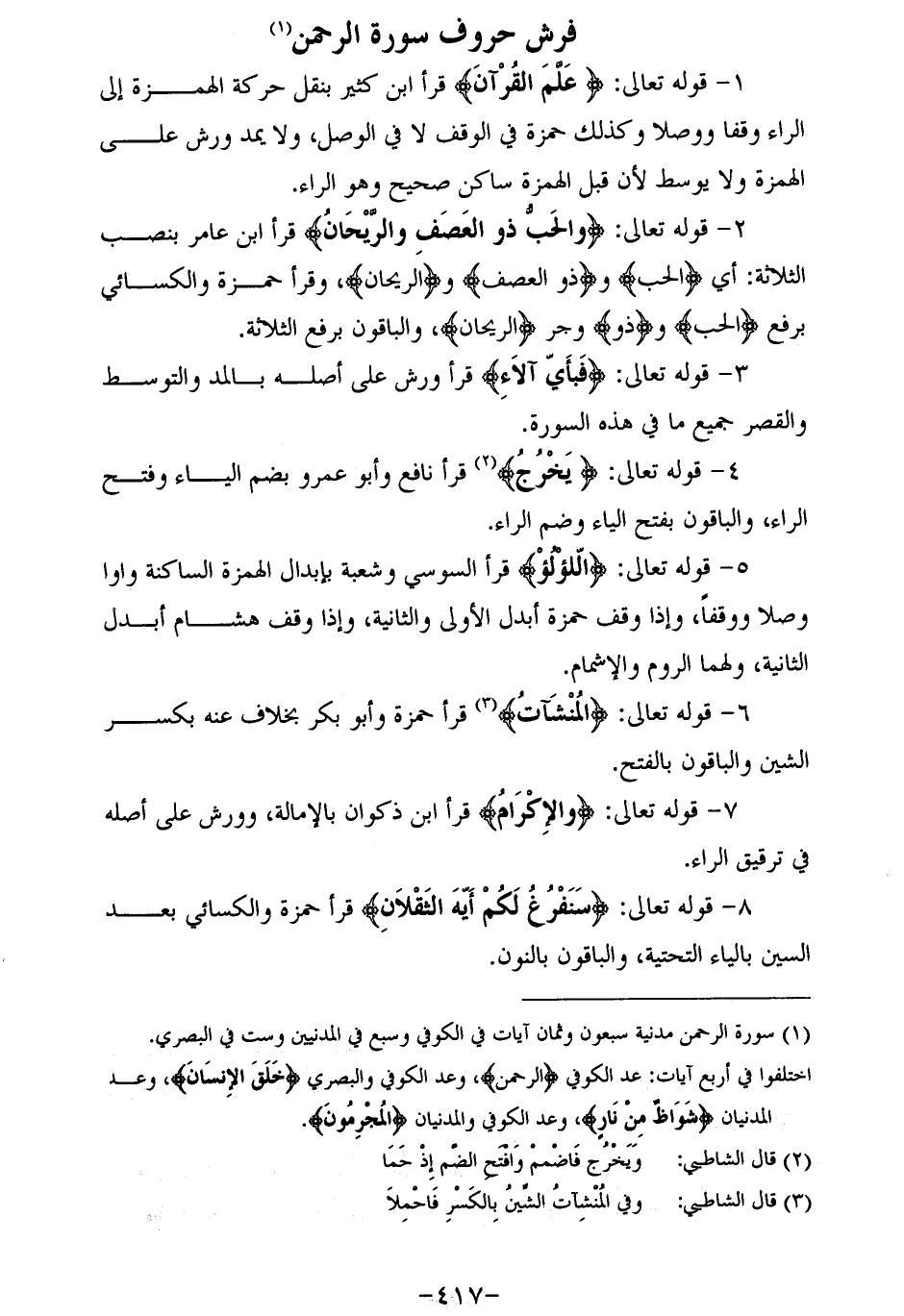 1 - قوله تعالى: عَلَّمَ الْقُرْآنَ قرأ ابن كثير بنقل حركة الهمزة إلى الراء وقفا ووصلا وكذلك حمزة في الوقف لا في الوصل، ولا يمد ورش على الهمزة ولا يوسط لأن قبل الهمزة ساكن صحيح وهو الراء.