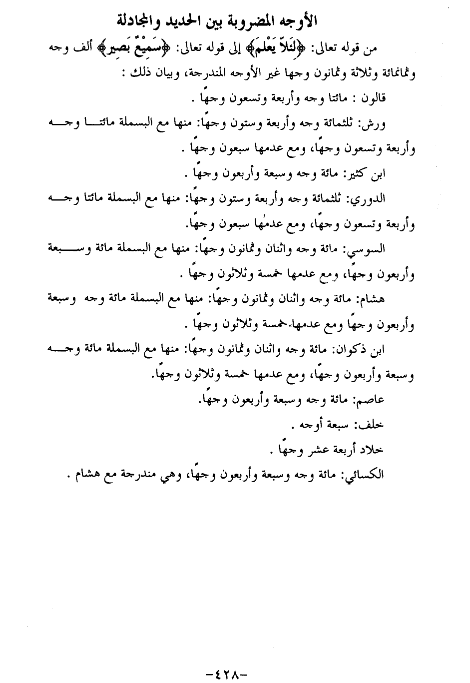 من قوله تعالى: لِئَلَّا يَعْلَمَ إلى قوله تعالى: سَمِيعٌ بَصِيرٌ ألف وجه وثمانمائة وثلاثة وثمانون وجها غير الأوجه المندرجة، وبيان ذلك: