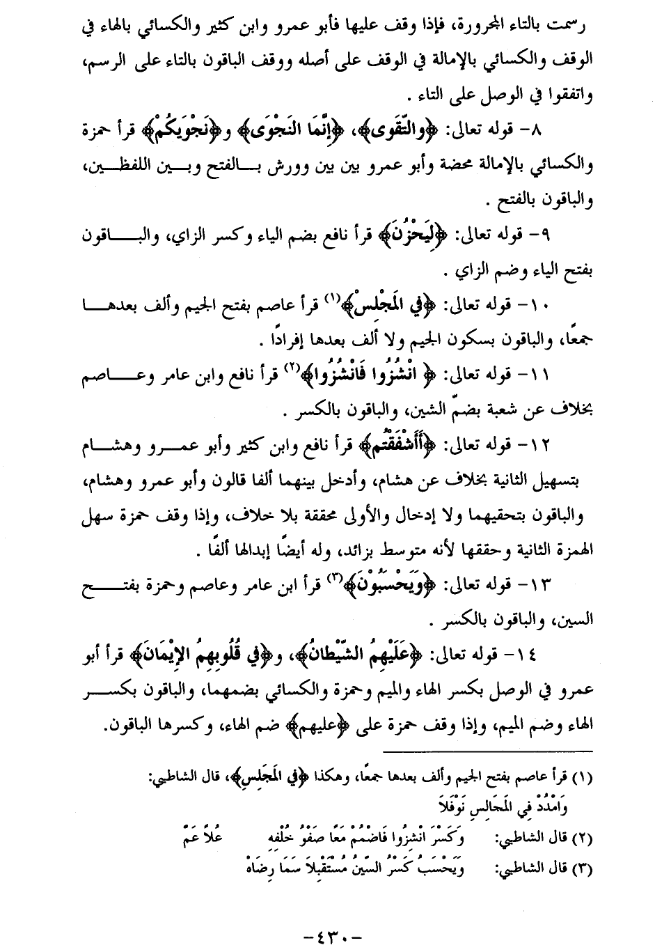 8 - قوله تعالى: وَالتَّقْوى، إِنَّمَا النَّجْوى ونَجْواكُمْ قرأ حمزة والكسائي بالإمالة محضة وأبو عمرو بين بين وورش بالفتح وبين اللفظين، والباقون بالفتح.
