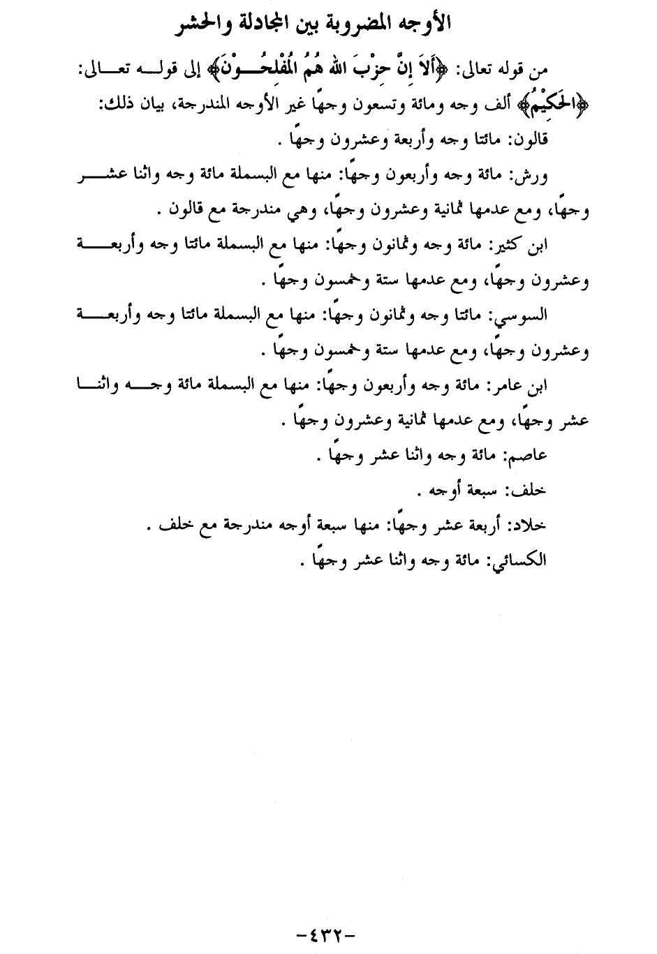 ابن كثير: مائة وجه وثمانون وجها: منها مع البسملة مائتا وجه وأربعة وعشرون وجها، ومع عدمها ستة وخمسون وجها.