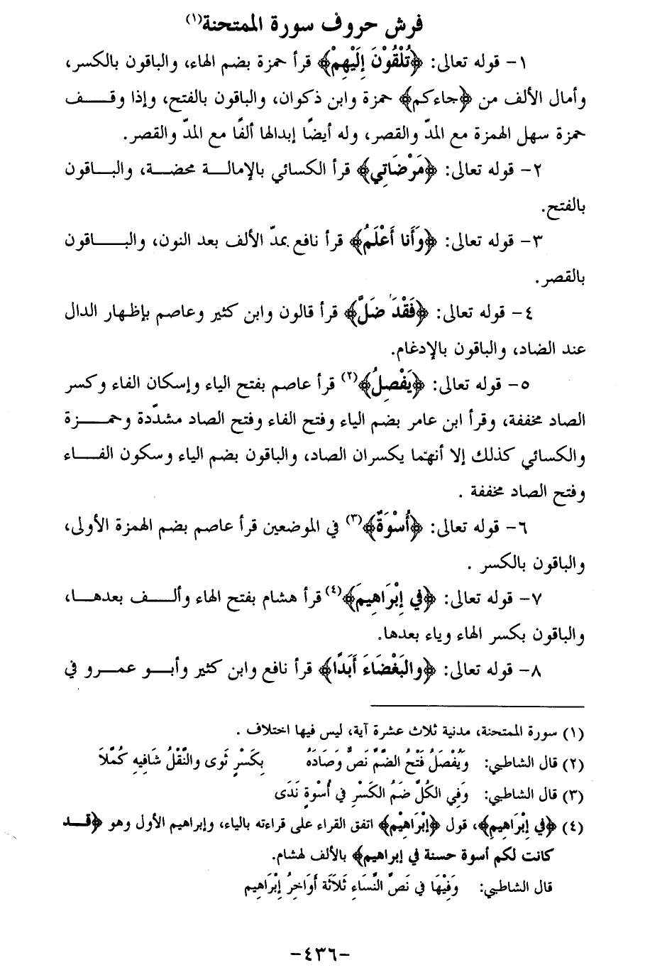 (¬4) فِي إِبْراهِيمَ، قول إِبْراهِيمَ اتفق القراء على قراءته بالياء، وإبراهيم الأول وهو قَدْ كانَتْ لَكُمْ أُسْوَةٌ حَسَنَةٌ فِي إِبْراهِيمَ بالألف لهشام.