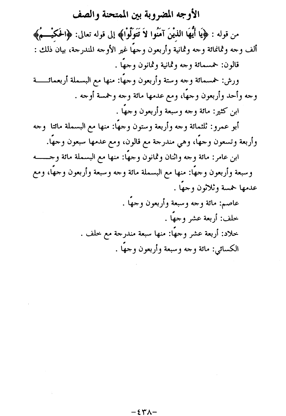ابن عامر: مائة وجه واثنان وثمانون وجها: منها مع البسملة مائة وجه وسبعة وأربعون وجها: منها مع البسملة مائة وجه وسبعة وأربعون وجها، ومع عدمها خمسة وثلاثون وجها.