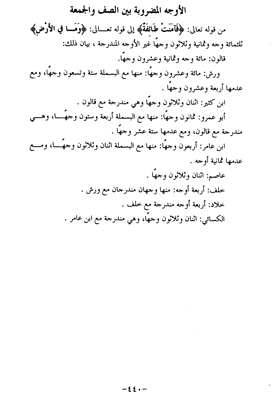 من قوله تعالى: فَآمَنَتْ طائِفَةٌ إلى قوله تعالى: وَما فِي الْأَرْضِ ثلاثمائة وجه وثمانية وثلاثون وجها غير الأوجه المندرجة، بيان ذلك: