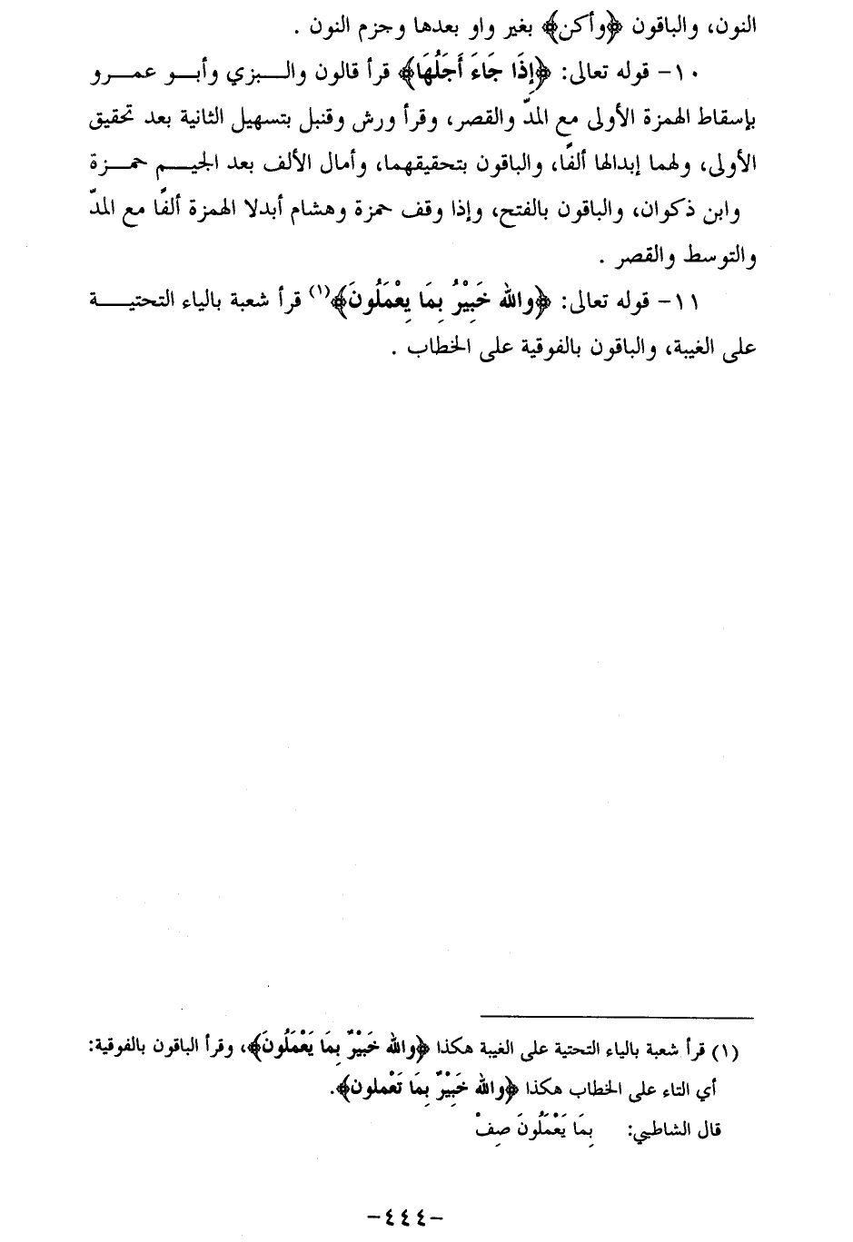 11 - قوله تعالى: (والله خبير بما يعملون) (¬1) قرأ شعبة بالياء التحتية على الغيبة، والباقون بالفوقية على الخطاب.
